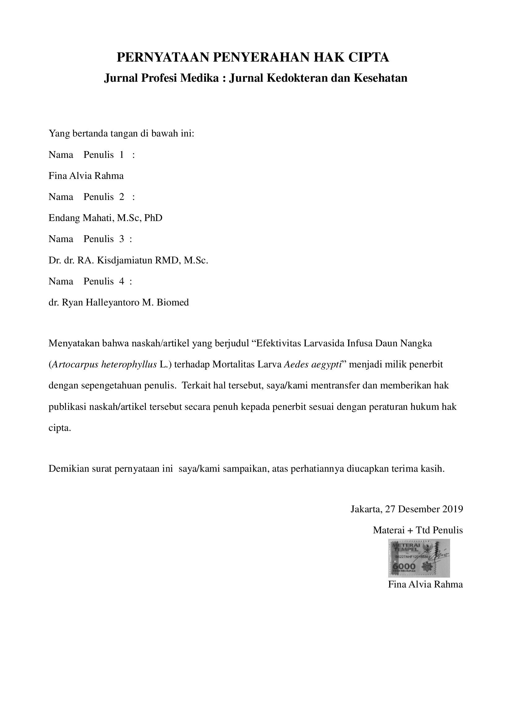 [6] Kriswandana F, Firdaus AA. Potensi Ekstrak Daun Nangka (Artocarpus Heterophyllus Lamk) sebagai Biolarvasida Nyamuk Culex sp. J Poltekkes Surabaya. 2016;347–59.